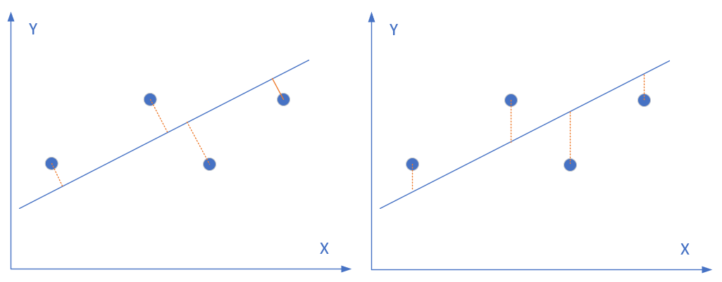 图4-3中,圆形点是样本点,直线是当前的拟合结果。如左图所示,我们是要计算样本点到直线的垂直距离,需要再根据直线的斜率来求垂足然后再计算距离,这样计算起来很慢;但实际上,在工程上我们通常使用的是右图的方式,即样本点到直线的竖直距离,因为这样计算很方便,用一个减法就可以了。