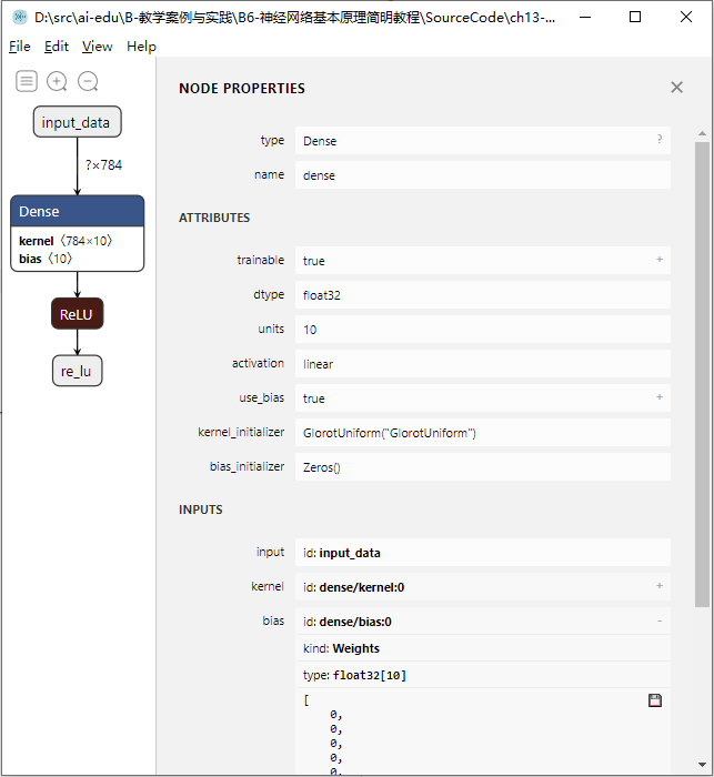 这里使用的网络非常简单,可以看到图13-5中一共有4个节点:输入节点、Dense层、ReLU层、输出节点,和我们代码中定义的一致。