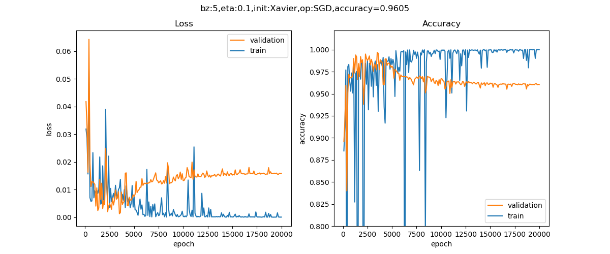 蓝色为训练集,红色为验证集。可以看到,训练集上的损失函数值很快降低到极点,精确度很快升高到极点,而验证集上的表现正好相反。说明网络对训练集很适应,但是越来越不适应验证集数据,出现了严重的过拟合。验证集的精确度为0.9605。