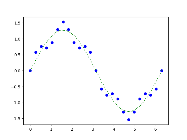 其中,绿色的点是公式1的第一部分的结果,蓝色的点是整个公式1的结果。我们可以把绿色的点作为测试/验证基线,可以看到它是一条标准的正弦曲线。而蓝色的点作为带噪音的训练样本,该训练样本只有25个数据。