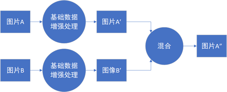 SamplePairing^{[2]}方法的处理流程如图16-35所示,从训练集中随机抽取两张图片分别经过基础数据增强操作(如随机翻转等)处理后经像素取平均值的形式叠加合成一个新的样本,标签为原样本标签中的一种。