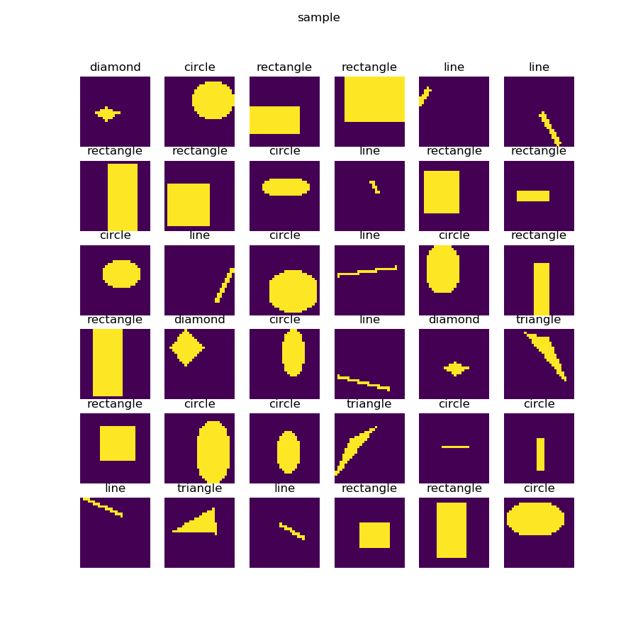 一共有5种形状:圆形、菱形、直线、矩形、三角形。上图中列出了一些样本,由于图片尺寸是28x28的灰度图,所以在放大显示后可以看到很多锯齿,读者可以忽略。需要强调的是,每种形状的尺寸和位置在每个样本上都是有差异的,它们的大小和位置都是随机的,比如圆形的圆心位置和半径都是不一样的,还有可能是个椭圆。